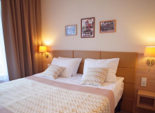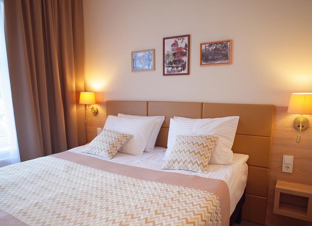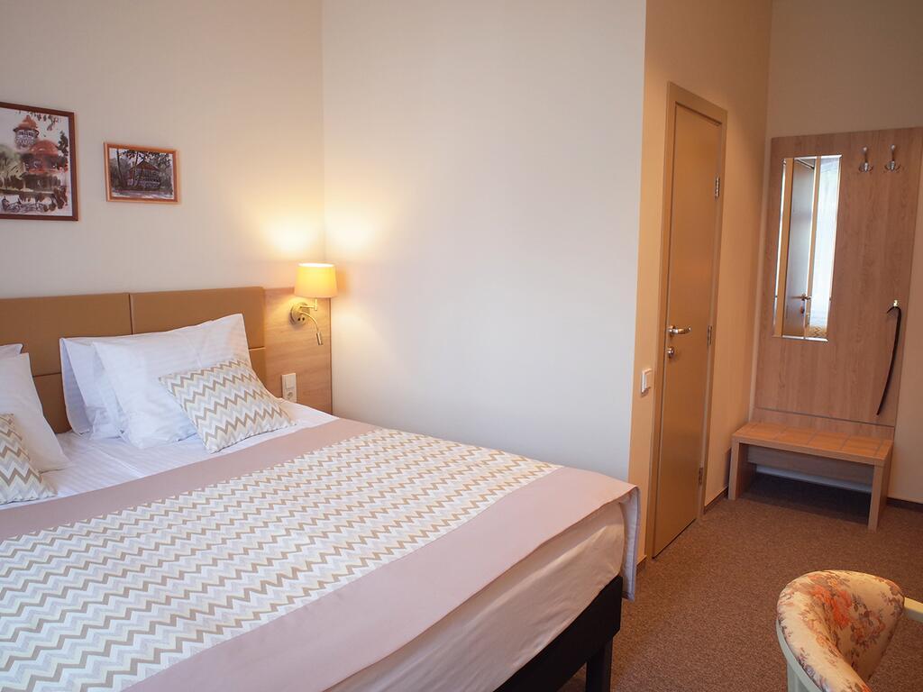 - Делюкс / Deluxe double room (40 кв. м): спальня с гостиной зоной (двуспальная или две отдельные кровати), ванная комната с душем. Расположены на 4 этаже. Вид на город.