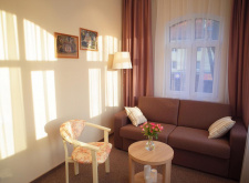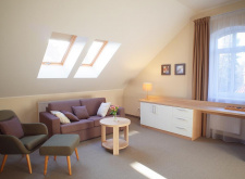 - Семейный люкс / Family suite (60 кв. м): гостиная, спальня с двуспальной или двумя отдельными кроватями, ванная комната с ванной и душем. Мансардные потолки. Расположены на 4 этаже.