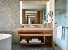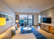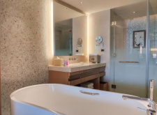 - RESORT ROOM (54 кв.м)- двухместный номер с одной кроватью king size. В номере бесплатный Wi-Fi, телефон, телевизор, вода, мини- бар, кофеварка/чайник, сейф(платный), утюг и гладильная доска, отдельная ванна и душ. Максимальная вместимость: 3 человека. Разрешена 1 раскладная кровать, 1 дополнительная детская кровать.