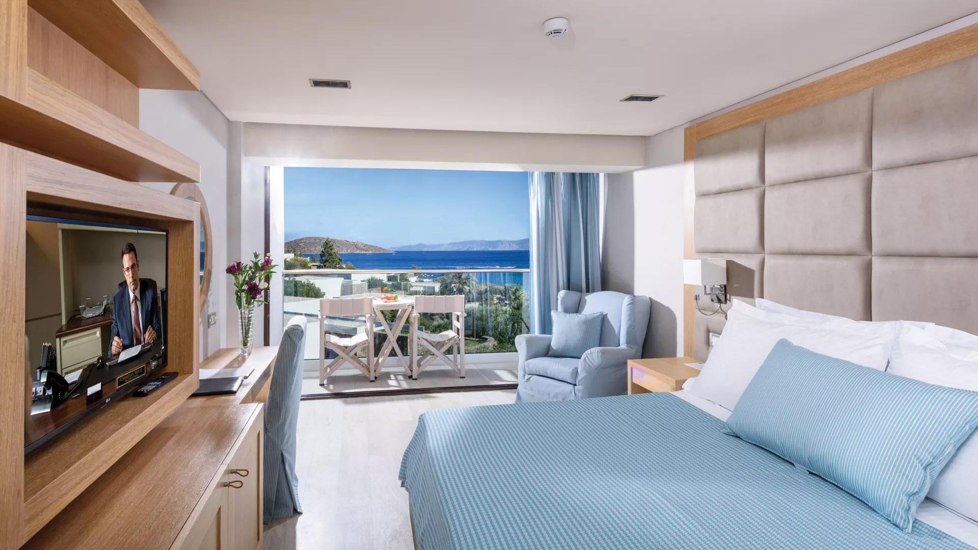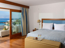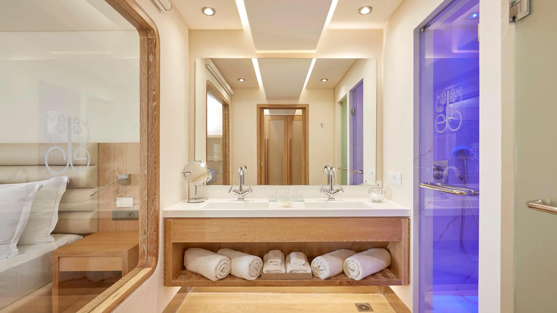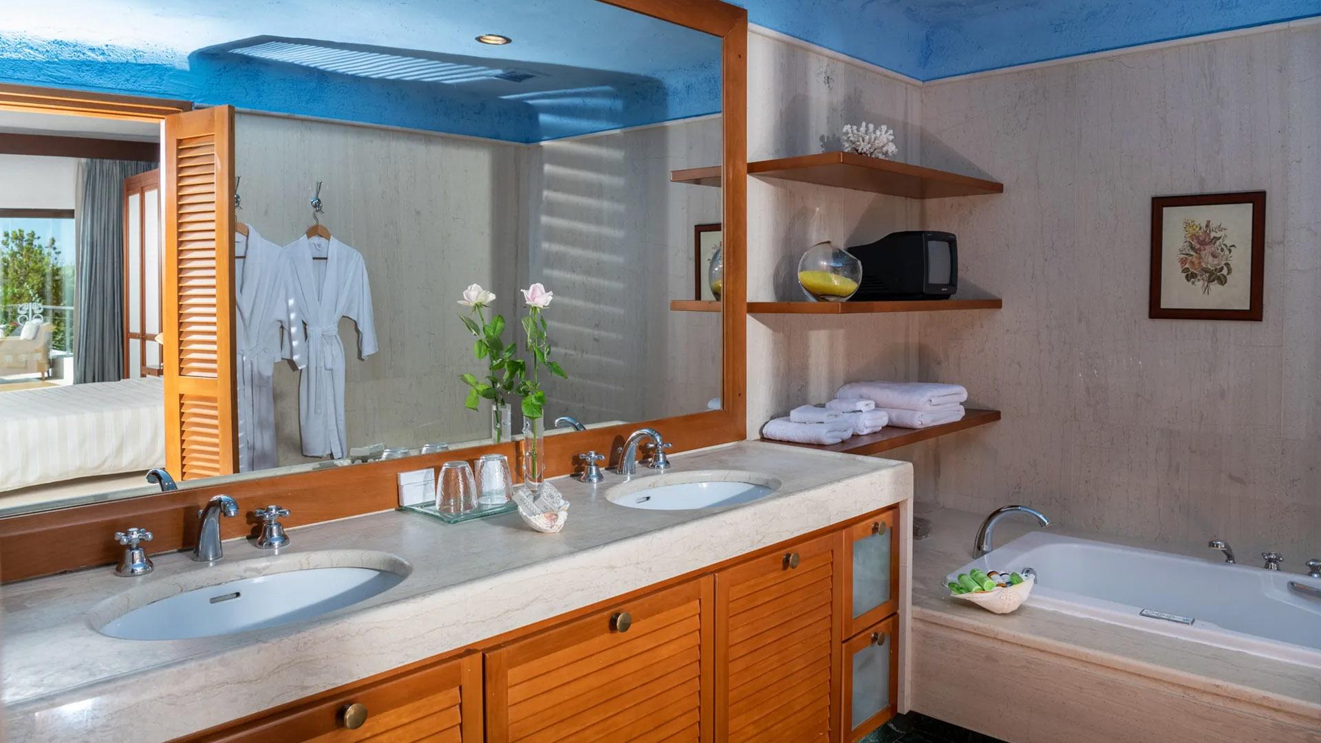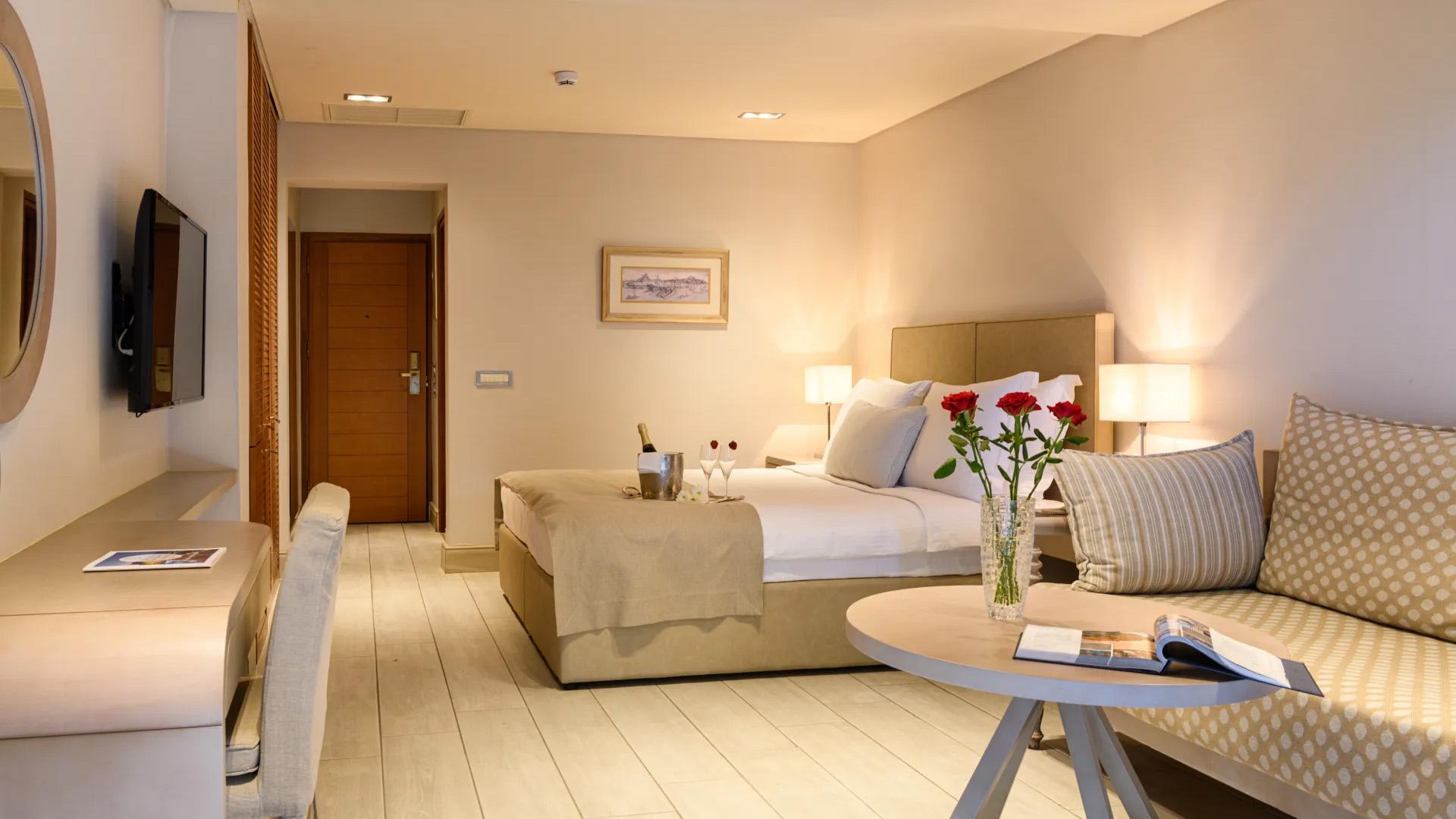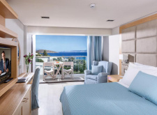 - Deluxe Hotel Suite Two Bathrooms Sea View – 55 кв.м (макс. 3+1): Gold Club; спальная комната с двуспальной кроватью и гостиная с диваном-кроватью раздельные либо открытой планировки, ванная комната с джакузи и отдельным душем, в некоторых оборудованы - парная или тренажеры, оборудованный балкон