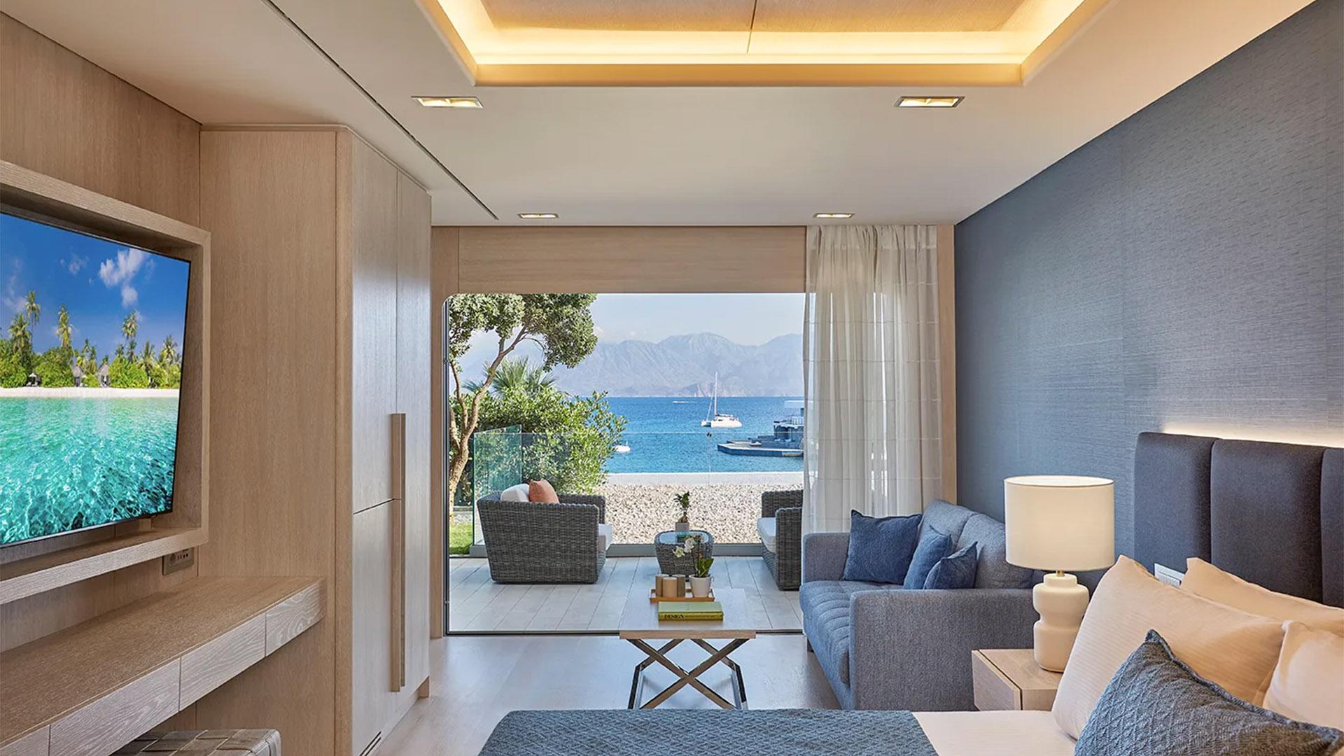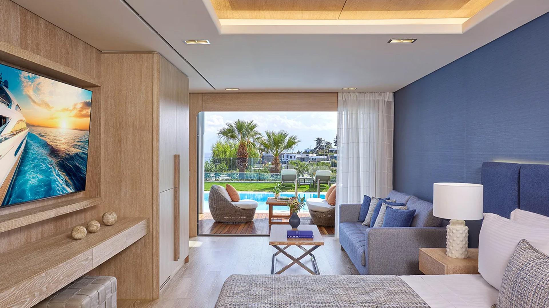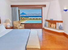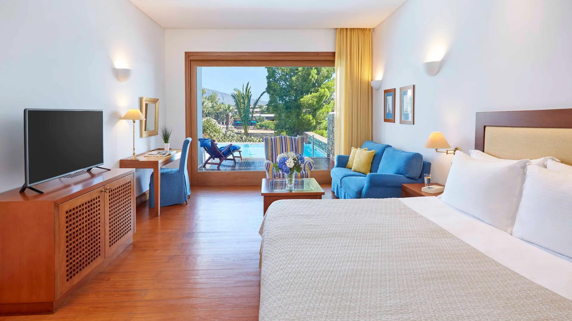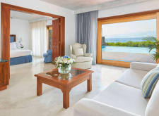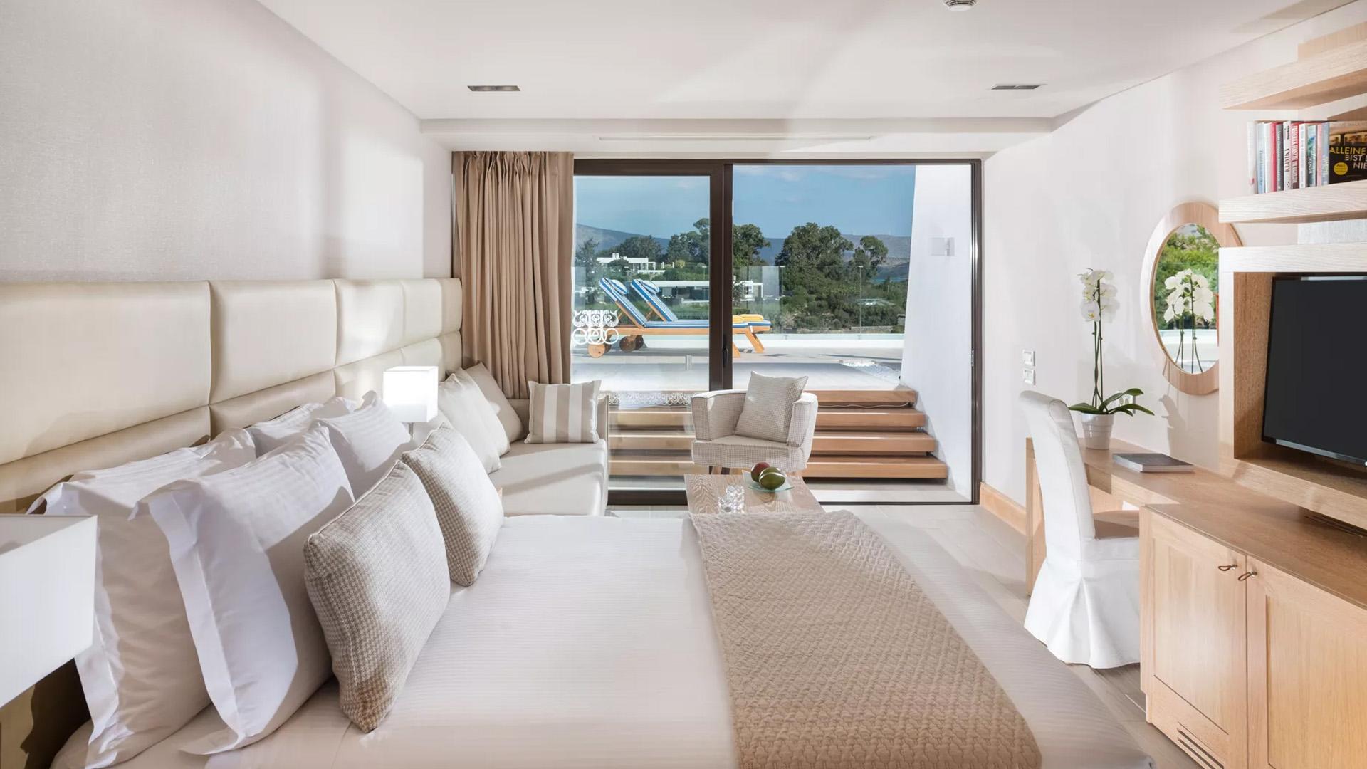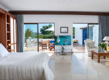 - Luxury Suite Sea View Sharing Pool – 50 кв.м (макс. 3): Gold Club; номер открытой планировки с двуспальной кроватью, гостевая зона с диваном-кроватью, ванная комната с джакузи, отдельная душевая и парная, оборудованная веранда, ведущая к общему бассейну