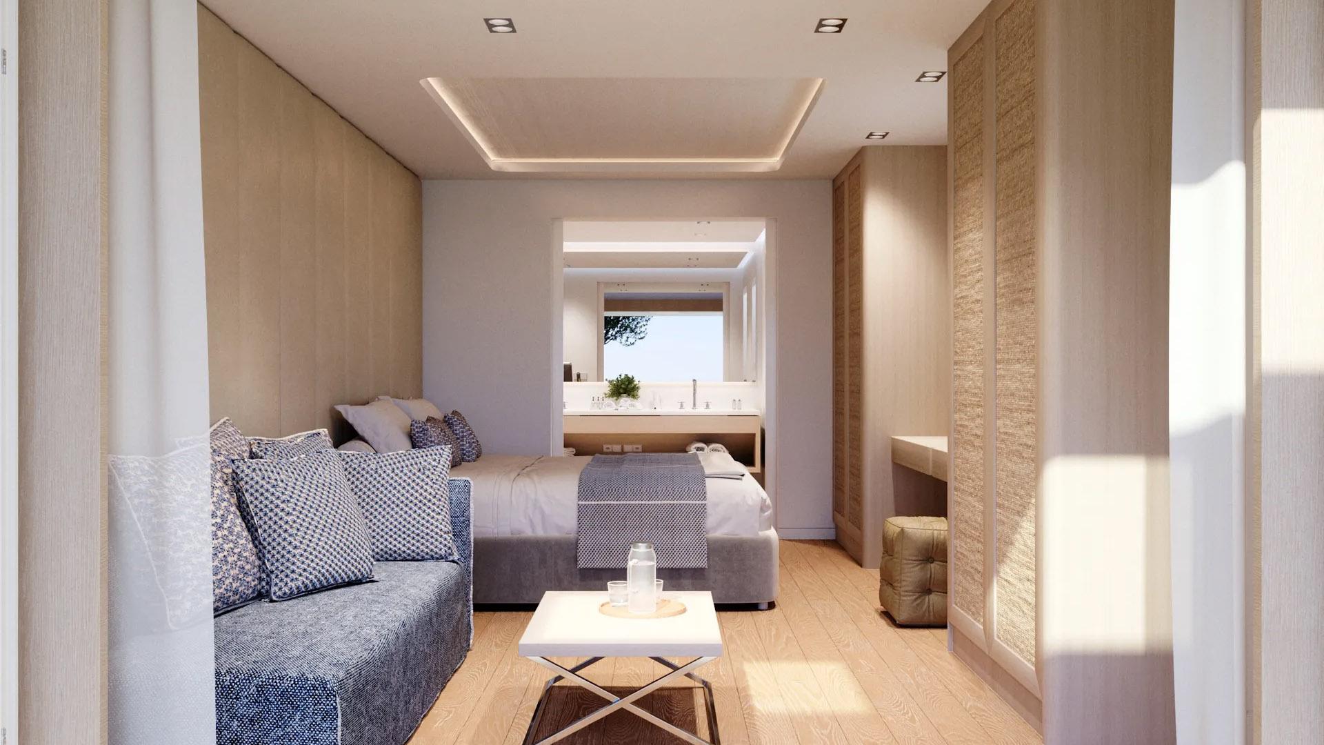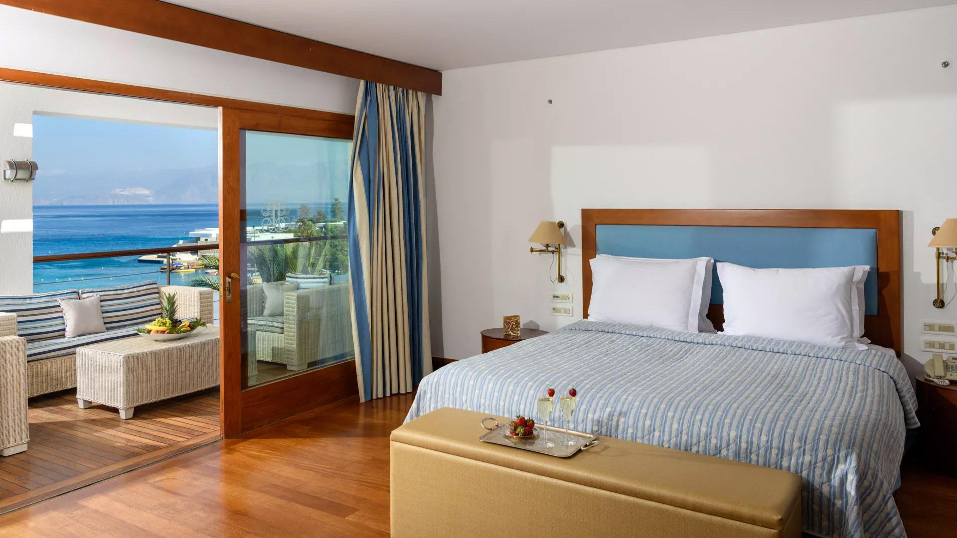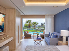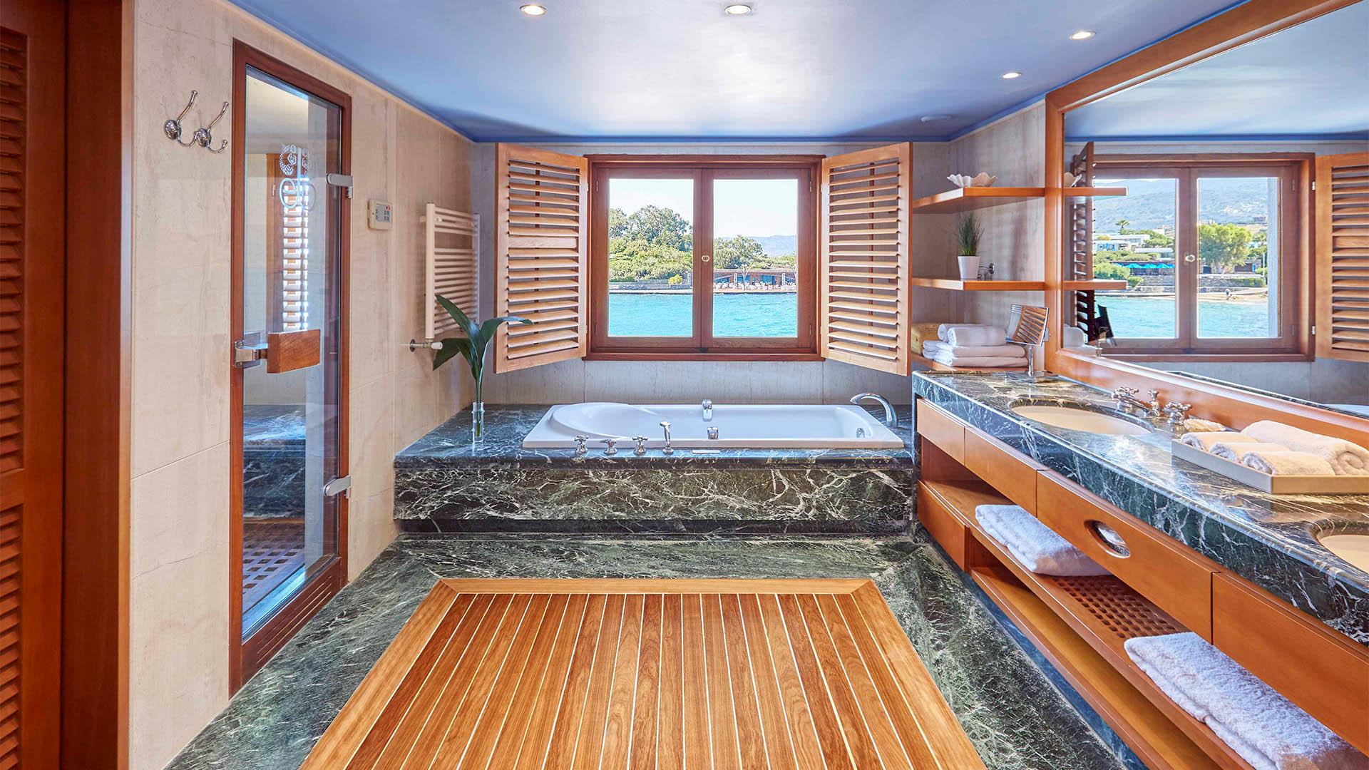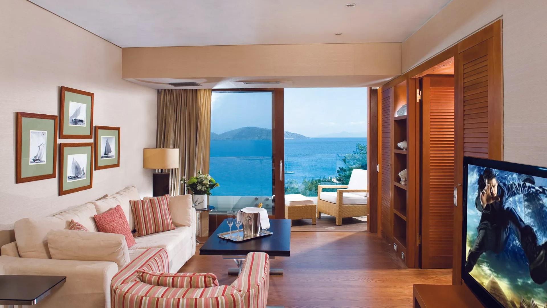 - Luxury Suite Sea View Sharing Pool – 50 кв.м (макс. 3): Gold Club; номер открытой планировки с двуспальной кроватью, гостевая зона с диваном-кроватью, ванная комната с джакузи, отдельная душевая и парная, оборудованная веранда, ведущая к общему бассейну