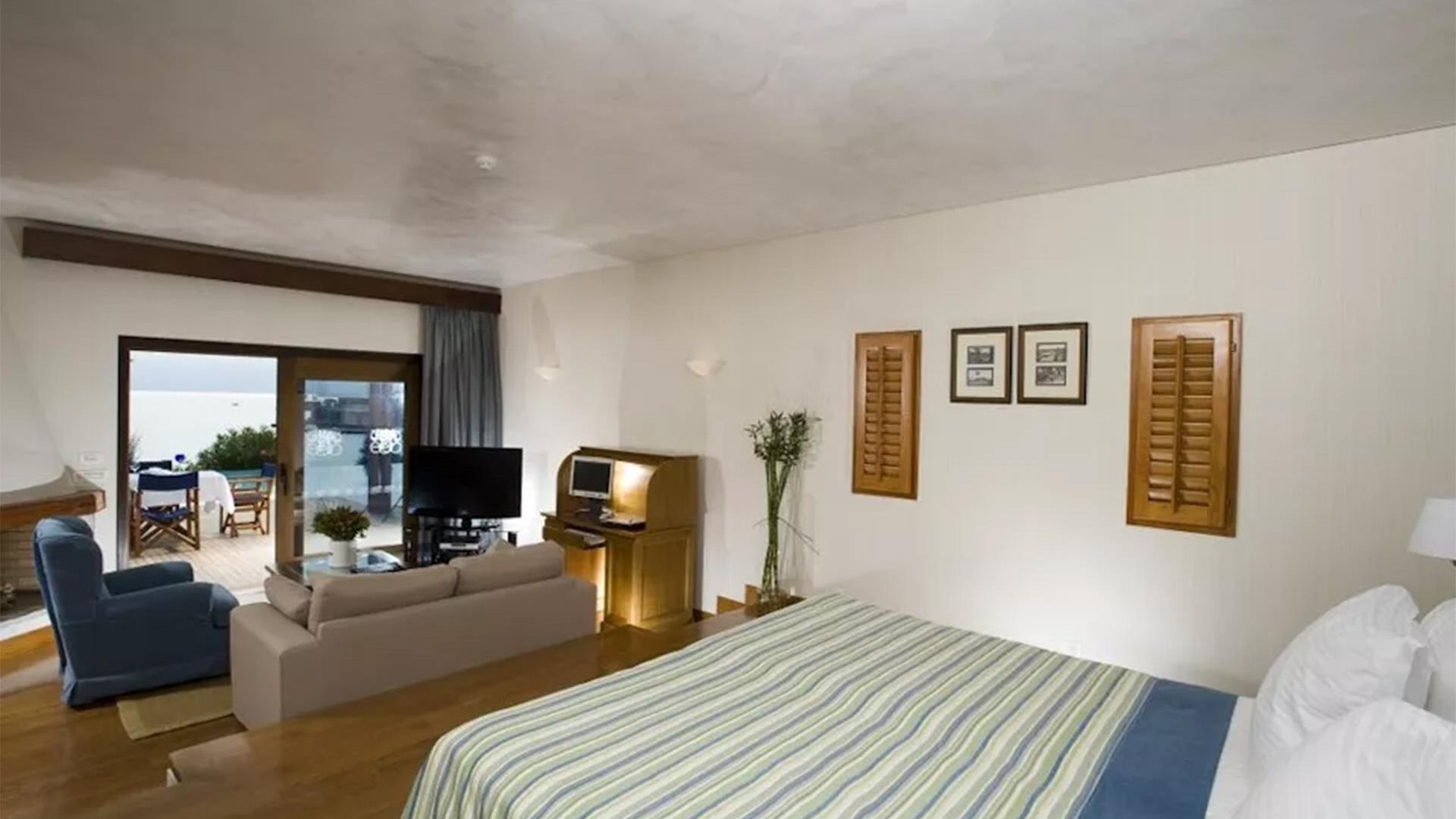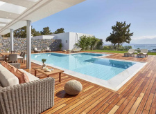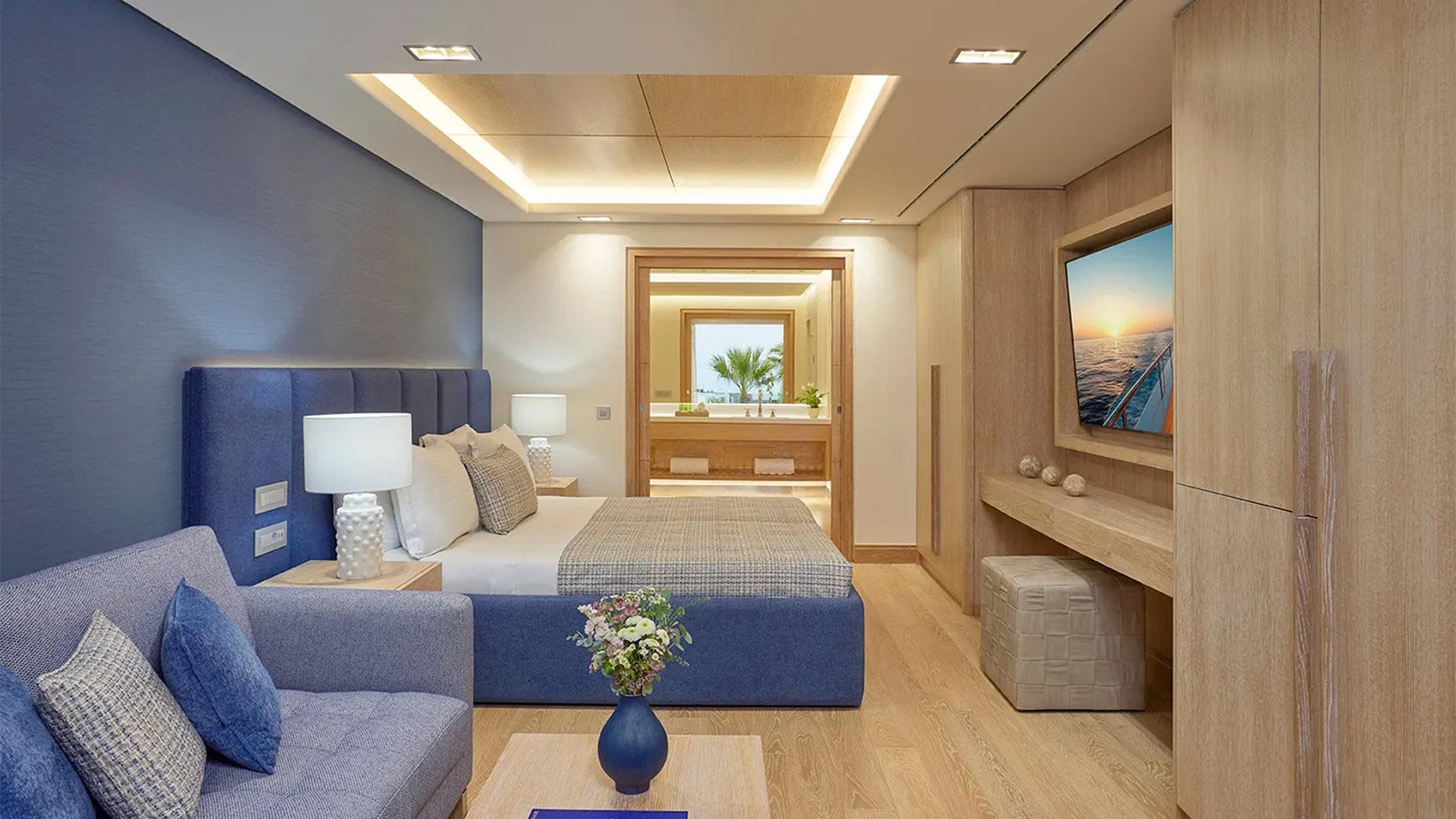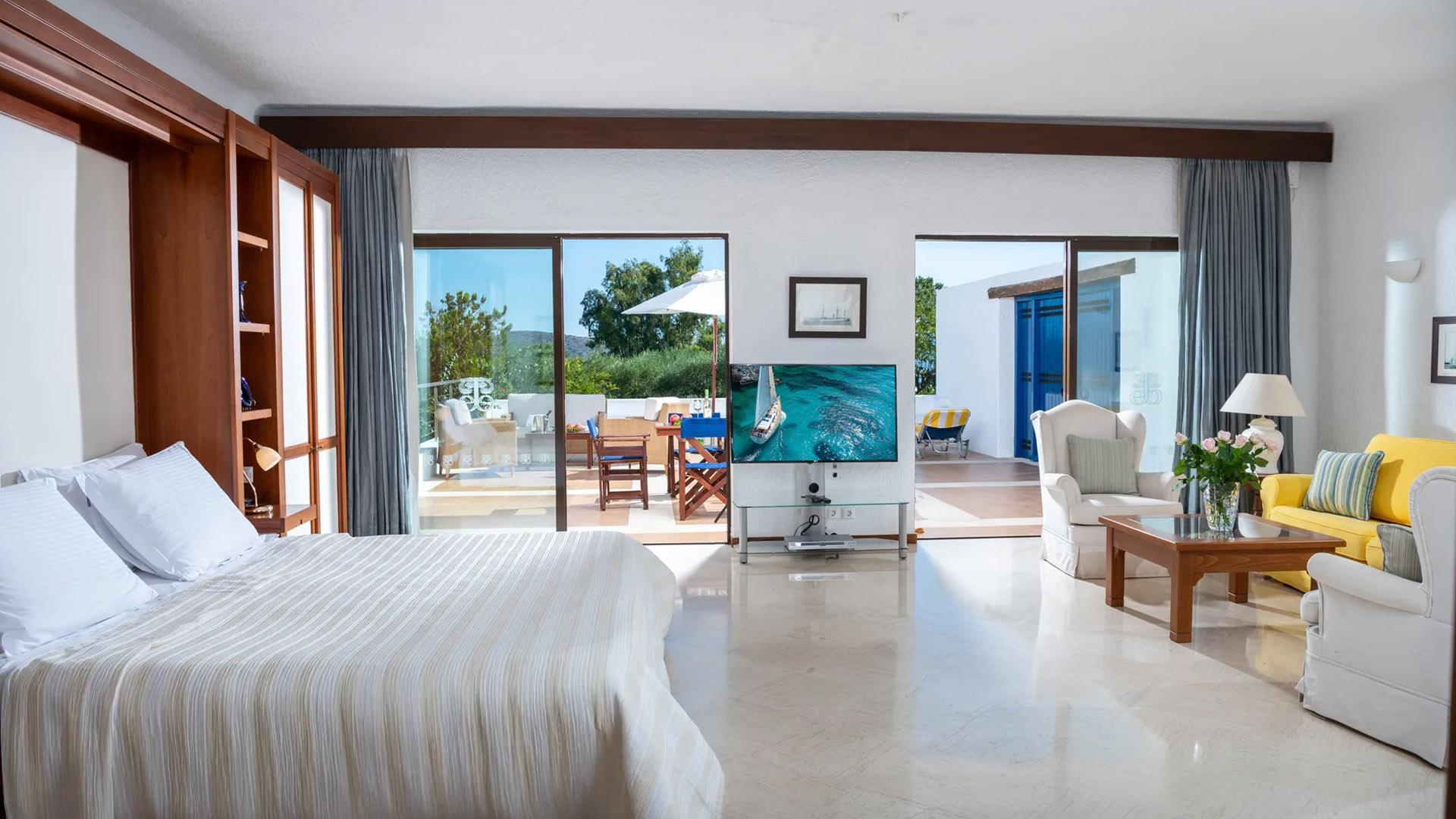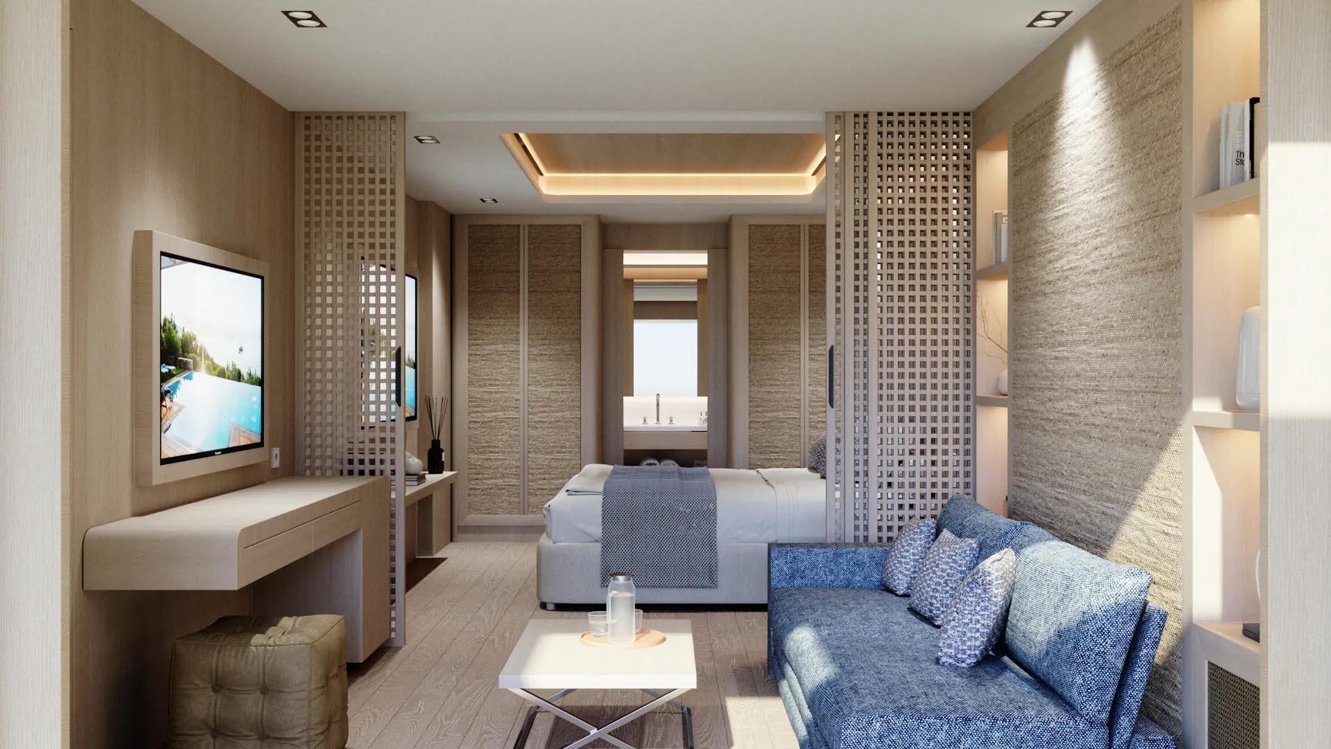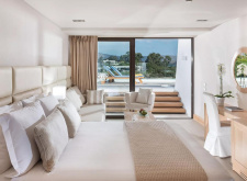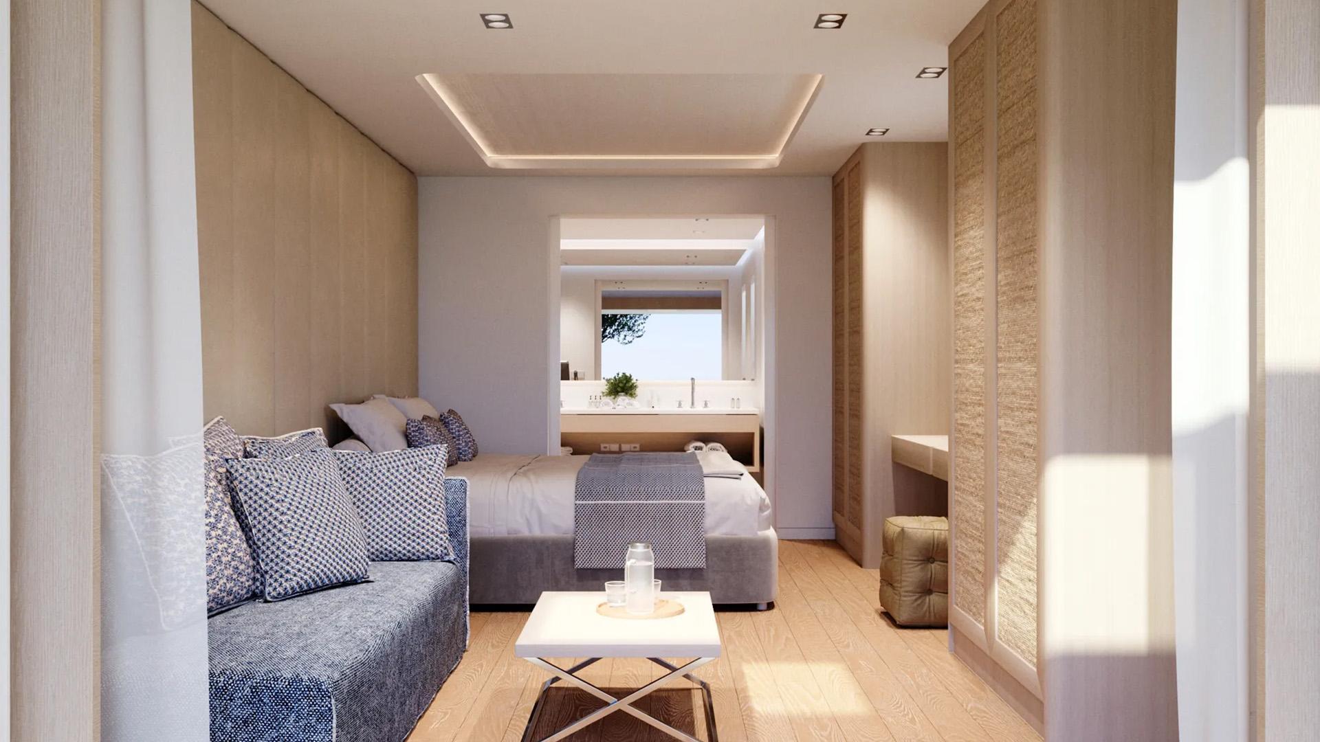 - Luxury Suite Sea View Sharing Pool – 50 кв.м (макс. 3): Gold Club; номер открытой планировки с двуспальной кроватью, гостевая зона с диваном-кроватью, ванная комната с джакузи, отдельная душевая и парная, оборудованная веранда, ведущая к общему бассейну