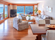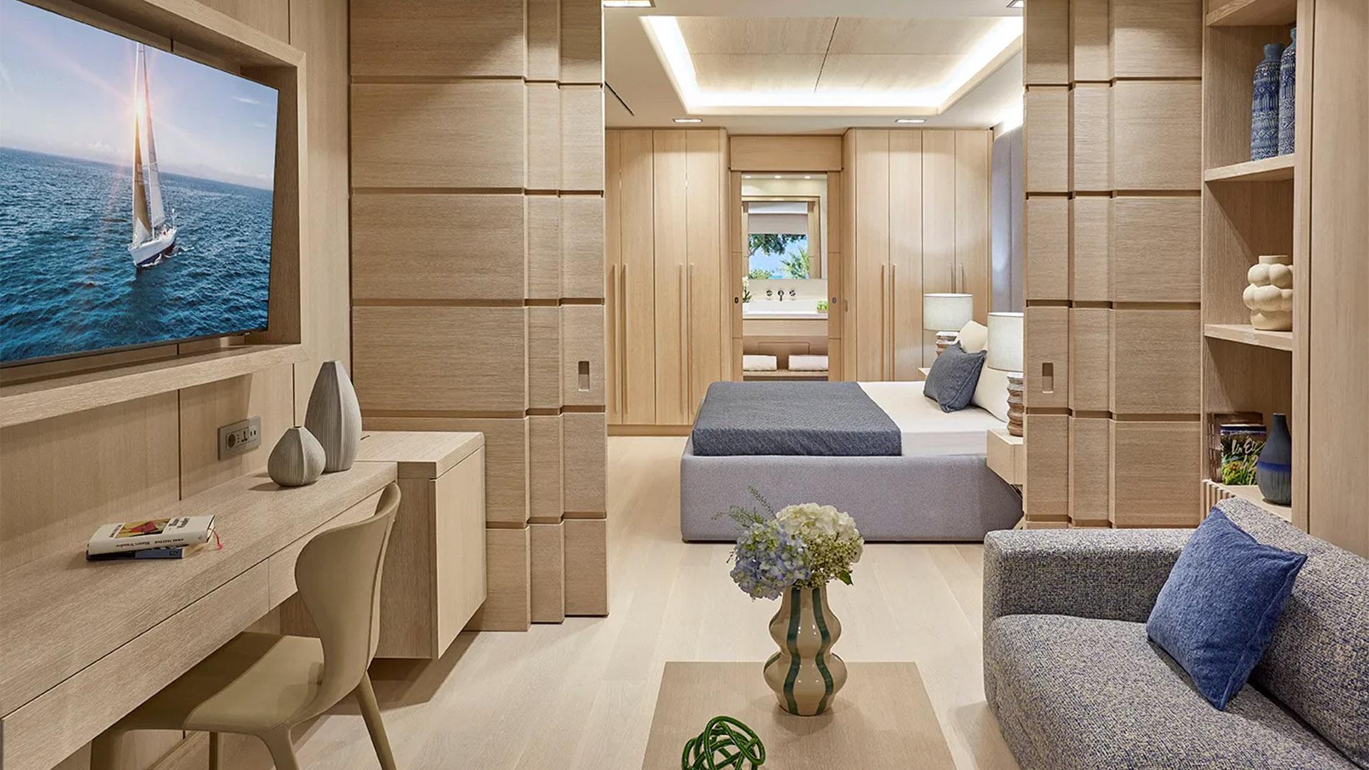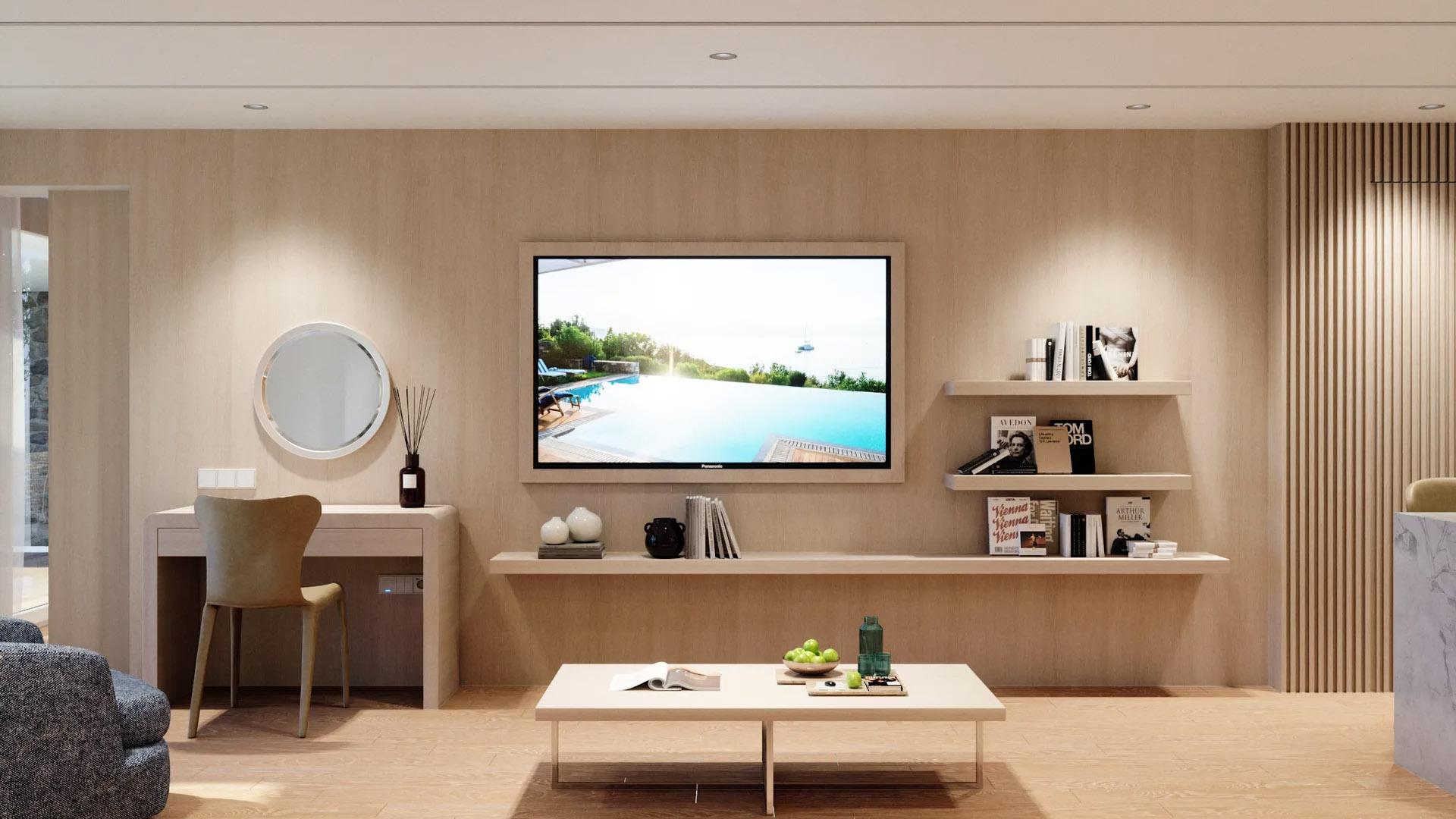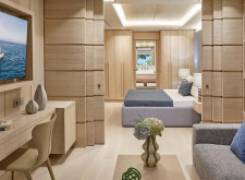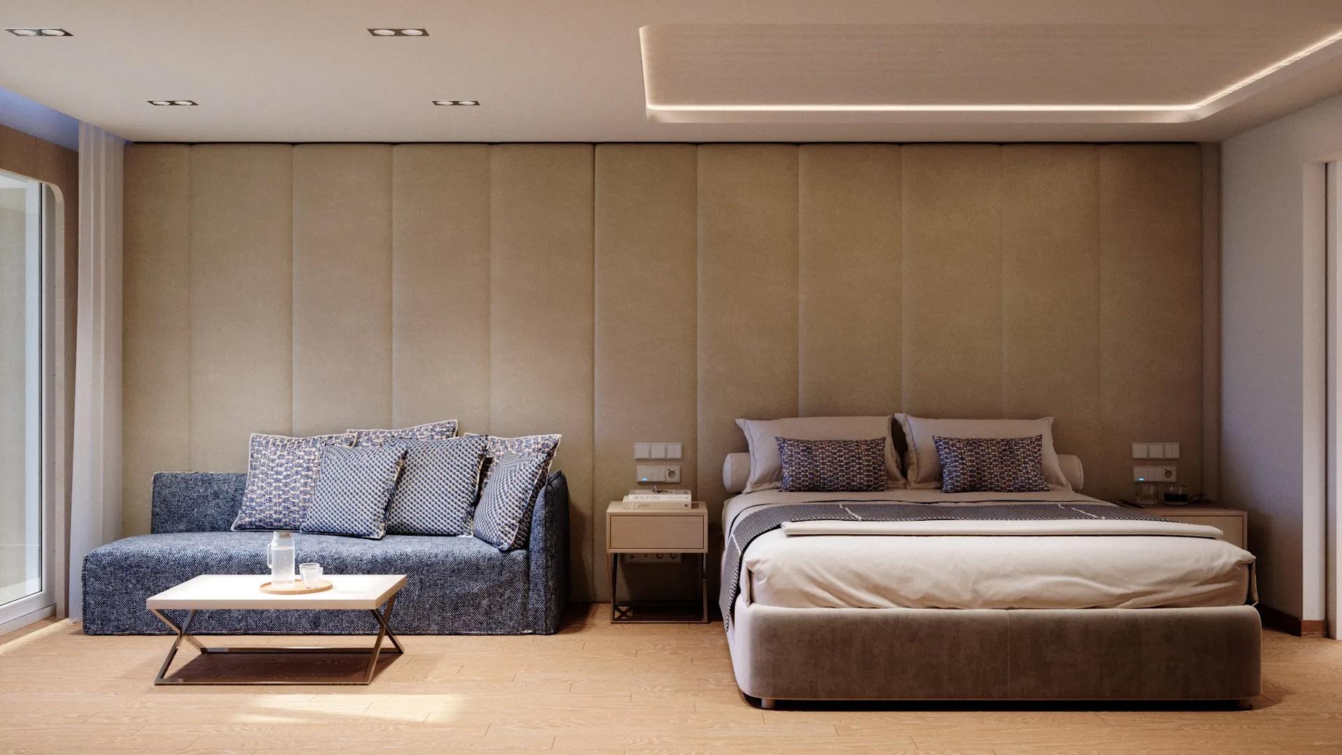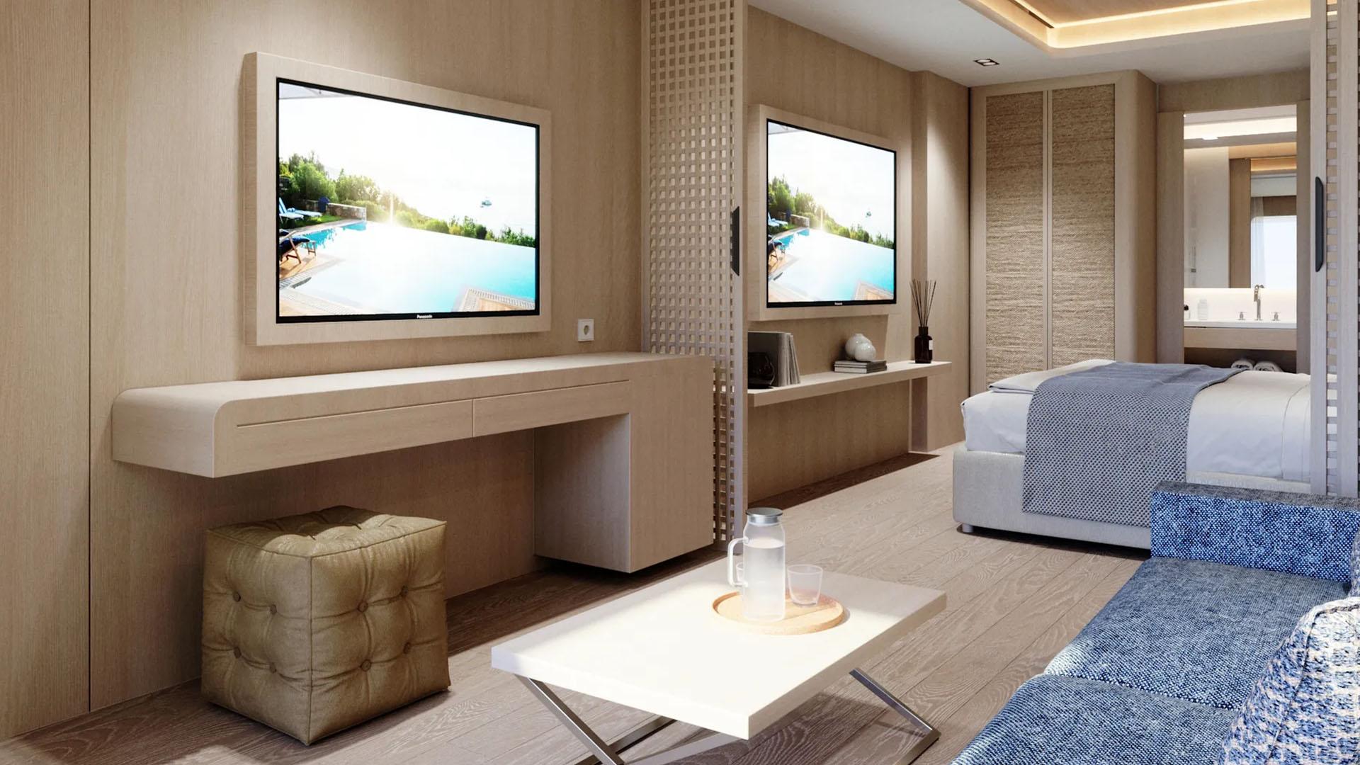 - Luxury Suite Sea View Sharing Pool – 50 кв.м (макс. 3): Gold Club; номер открытой планировки с двуспальной кроватью, гостевая зона с диваном-кроватью, ванная комната с джакузи, отдельная душевая и парная, оборудованная веранда, ведущая к общему бассейну