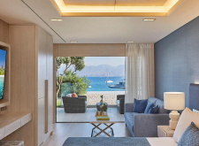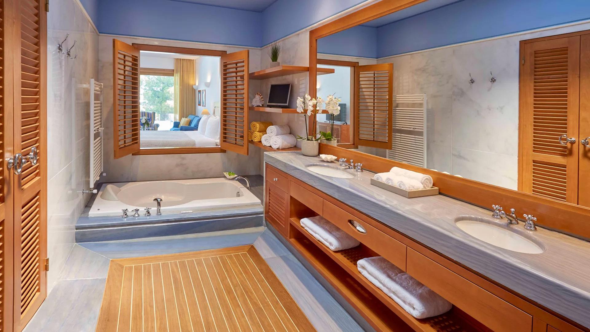 - Junior Bungalow Suite Two Bathrooms Front Sea View Sharing Pool – 65 кв.м (макс. 3+1): Gold Club-1-я береговая линия; спальная комната с двуспальной кроватью, отдельная гостиная с диваном-кроватью, ванная комната с джакузи, отдельная душевая и парная, WC с душем, оборудованная веранда с доступом к общему бассейну