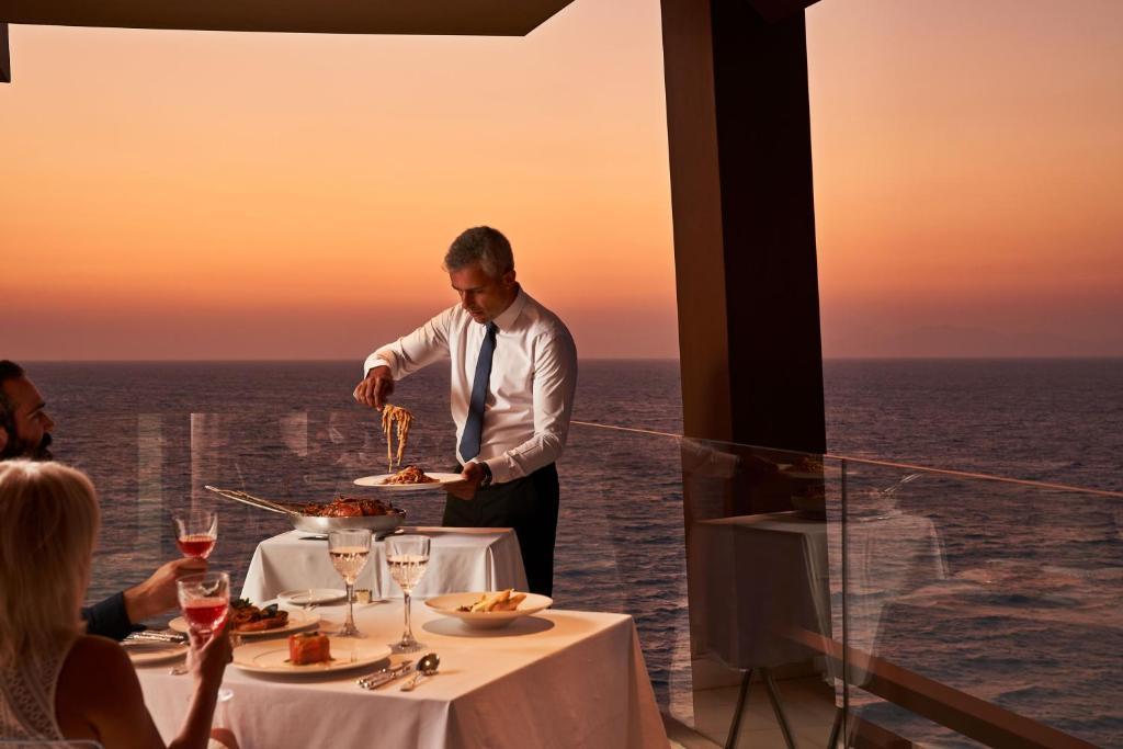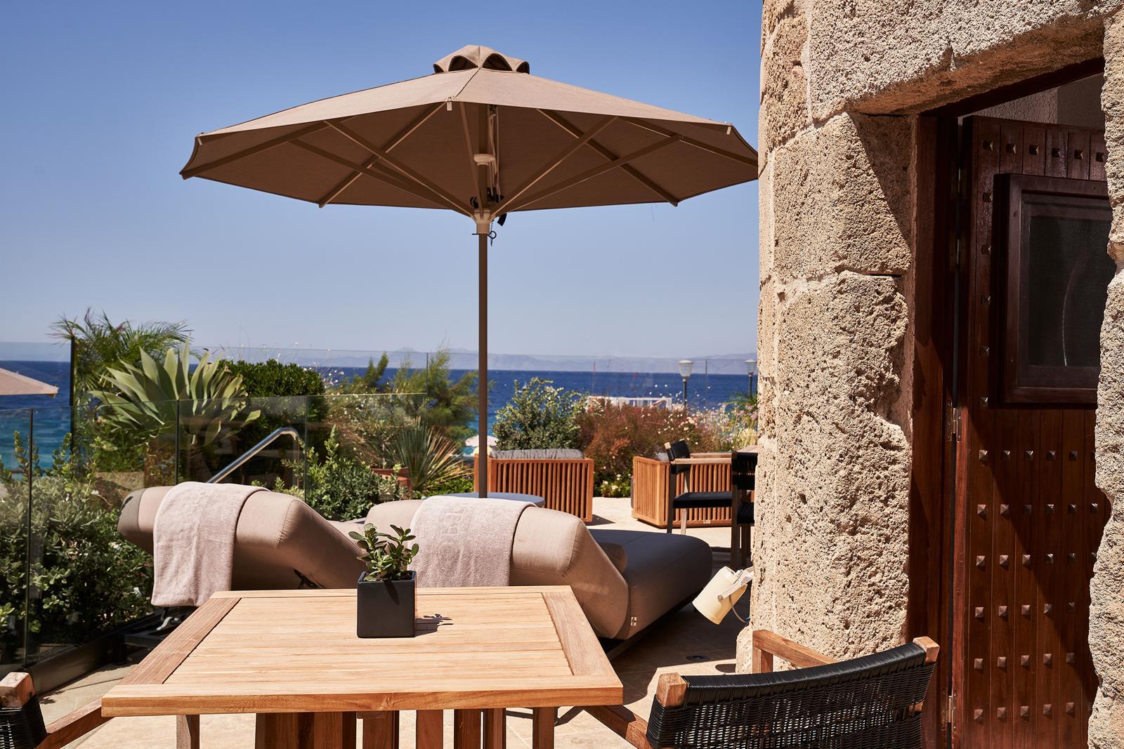 Penthouse Suite (65 кв.м.; макс. 2 чел) Номер расположен на верхнем этаже и выходит на балкон с панорамным видом на Эгейское море. Он имеет 2 ванные комнаты с гидромассажным душем. Номер состоит из просторной гостиной зоны с телевизором с плоским экраном - мини-кухня с кофемашиной Nespresso, керамической плитой.