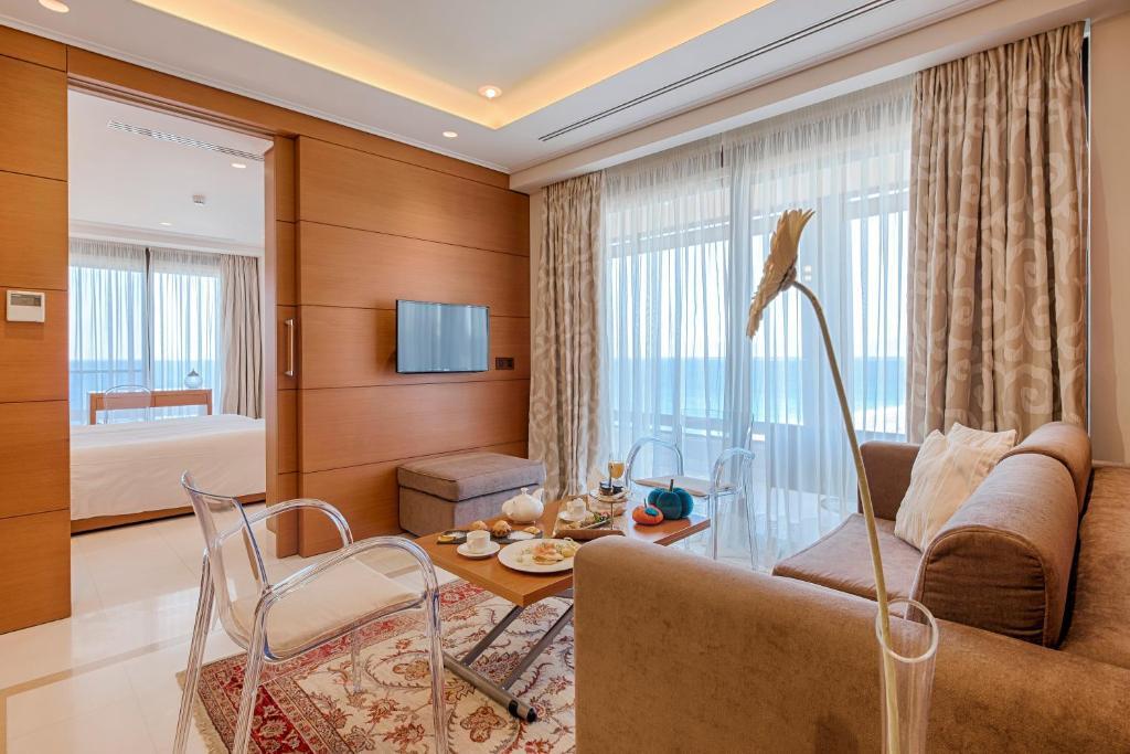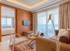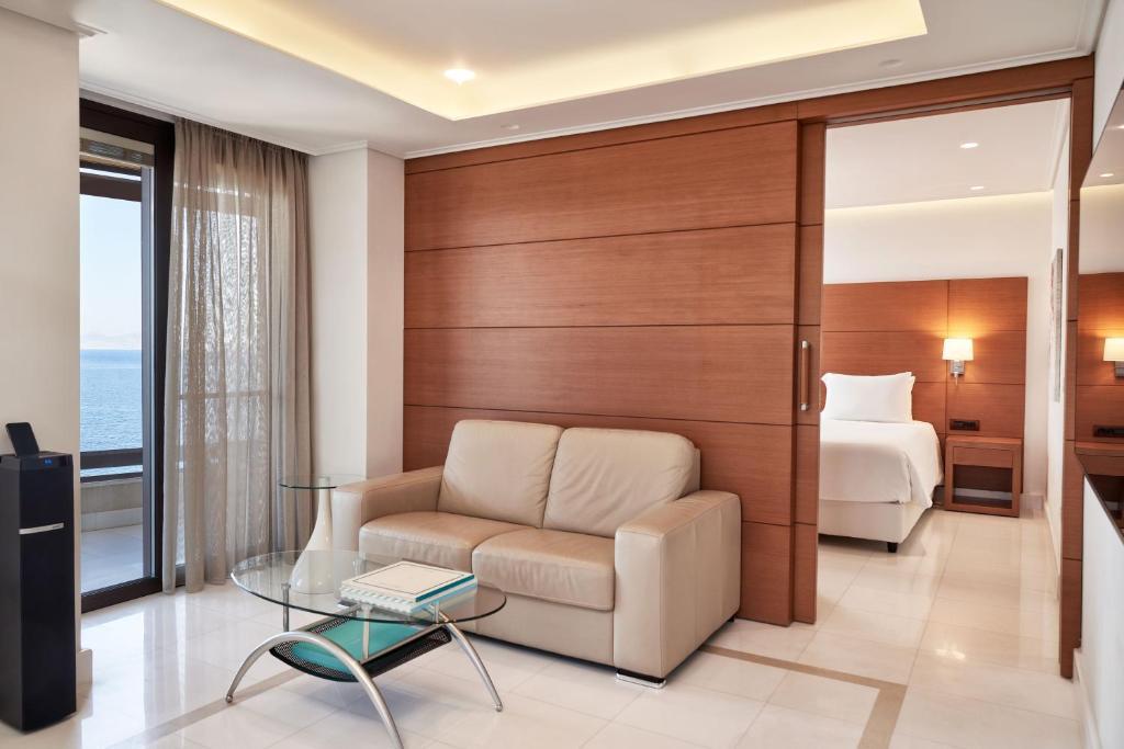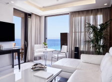Suite One Bedroom (62 кв.м.; макс. 3 чел) Люкс с кондиционером, гидромассажным душем и балконом с видом на Эгейское море. Номер состоит из гостиного уголка с телевизором с плоским экраном - мини-кухней с кофемашиной Nespresso, керамической плитой.