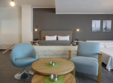 - Junior Suite 34 кв. м. (макс. 3+1) 1 двуспальная кровать и 2 односпальные кровати, зона отдыха и столик, туалетная комната