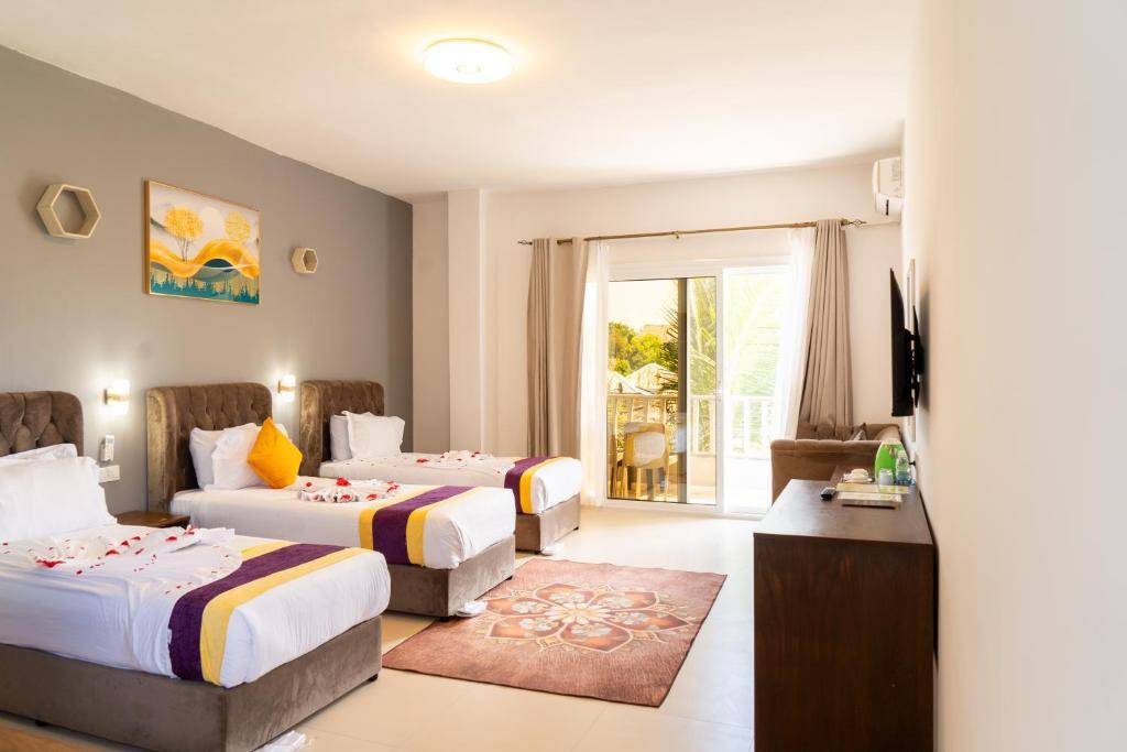 - FAMILY SUITE WITH BALCONY AND OCEAN VIEW (80 кв.м) Семейный двухкомнатный номер с видом на океан и сад. В одной комнате располагается кровать размера king-size, а во второй комнате две двуспальные кровати. В номере есть кондиционер, чайник, ванная комната, телевизор с технологией Smart TV, Wi-Fi и мини -холодильник.